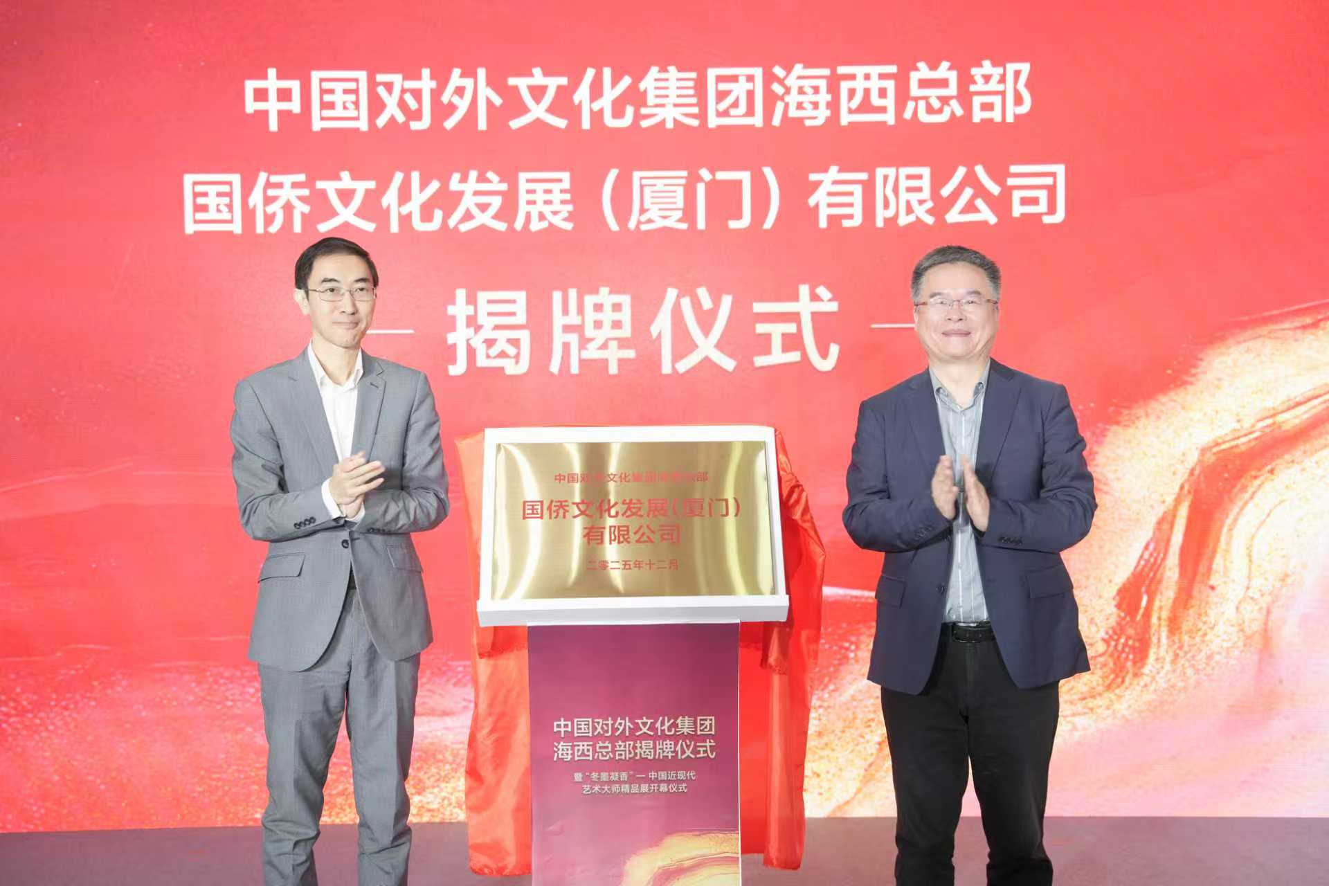 12月13日,中國對外文化集團海西總部揭牌儀式暨“冬墨凝香——中國近現代藝術大師精品展”開幕活動在廈門市博物館隆重舉行。這標志著作為對外文化交流“國家隊”和“主力軍”的中國對外文化集團正式落子廈門,開啟了立足海西、輻射兩岸、聯通國際的文化交流新篇章。中國對外文化集團黨委副書記、董事、總經理郭利群,中國對外文化集團海西總部總經理、中演演出院線發展有限責任公司常務副總經理洪寧,廈門市委市政府及各企事業單位嘉賓,以及中演演出院線發展有限責任公司在福建各直營劇院領導等嘉賓共同出席活動。